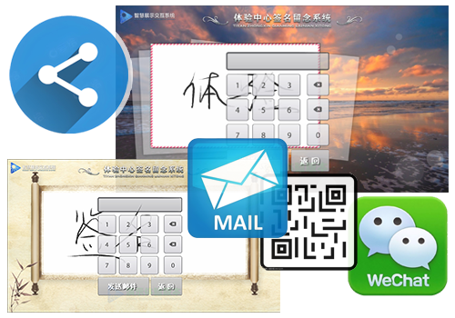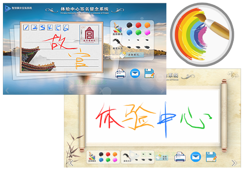 智慧签名留念系统,在现代展厅中有着广泛的应用场景,他融合了当今主流的留念互动模块,如:电子签名、书法笔触、画板、相框拍照、背景抠像、打印明信片、邮件分享、微信分享等多种体验于一身,为展厅增添了精彩的一笔,游客在此驻足留下美好的参观体验与感悟,将拍照、签名通过发送至邮箱、上传微信扫码,即可将精彩的瞬间带走,留下美好的纪念,同时可将照片、签名等飞入大屏幕画面中进行联动呈现展示,兼具了丰富的可拓展性。