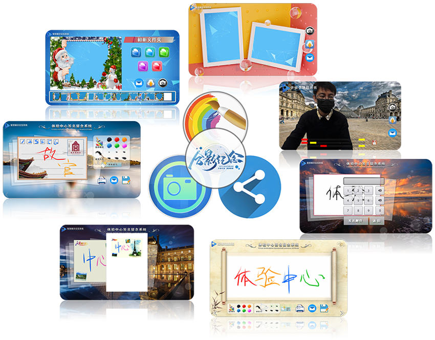 多媒体展项中对高清相机的运用也是必不可少的,在系统中,集成了:支持相框的拍照模块及支持蓝幕/绿幕的抠像模块,同时,支持打印、微信分享、邮件分享等功能,丰富了用户的选择。